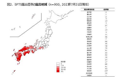 さらに重要なことは、SFTSに感染した動物(ペット)の看病の最中に吐物や下痢に素手で触れた飼い主が感染したことが判明しました。この感染経路は非常に重要で、従来のマダニからの感染予防だけでなく、ペットがマダニ噛まれないようにしないといけなくなりました。