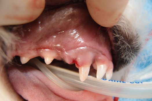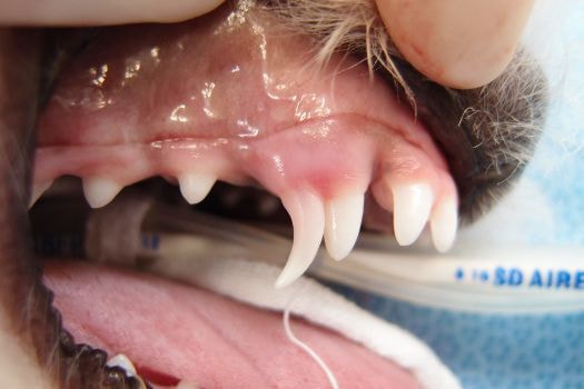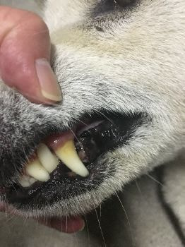 ところが他の歯が抜けているのに、写真のように犬歯だけが残ってしまうことがあります。特に小型犬が多いため5ヶ月齢なのに左右の歯の数が違っていたり、とがった歯が多いと思ったら動物病院を受診してください。