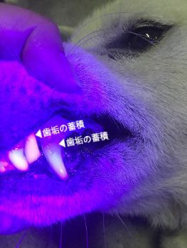 14歳の高齢ですので茶色に変色した歯石は多少付着していますが、見た目では全体として綺麗です。しかし紫外線を照射すると赤く変色し、歯垢の存在を表しています。
