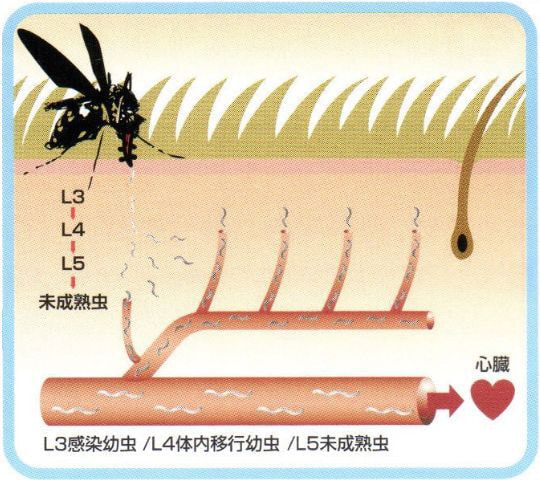少し専門的な説明になります。蚊がフィラリア感染犬を吸血することにより、フィラリアの子虫(L1)は蚊の体内に入ります。その後蚊の体内でL3に成長して、蚊の口の所まで移動し今か今かと吸血する機会をうかがっています。蚊がもう一度吸血すると犬の皮膚の中に潜り込み寄生することができます。その後、2〜3ヶ月かけて皮下組織、筋肉・脂肪などで発育し、毛細血管に到達します。その間にL3〜L5まで成長し、毛細血管に到達したL5の子虫はさらに6ヶ月ほど経つと成虫となり子虫(L1)を生むようになります。